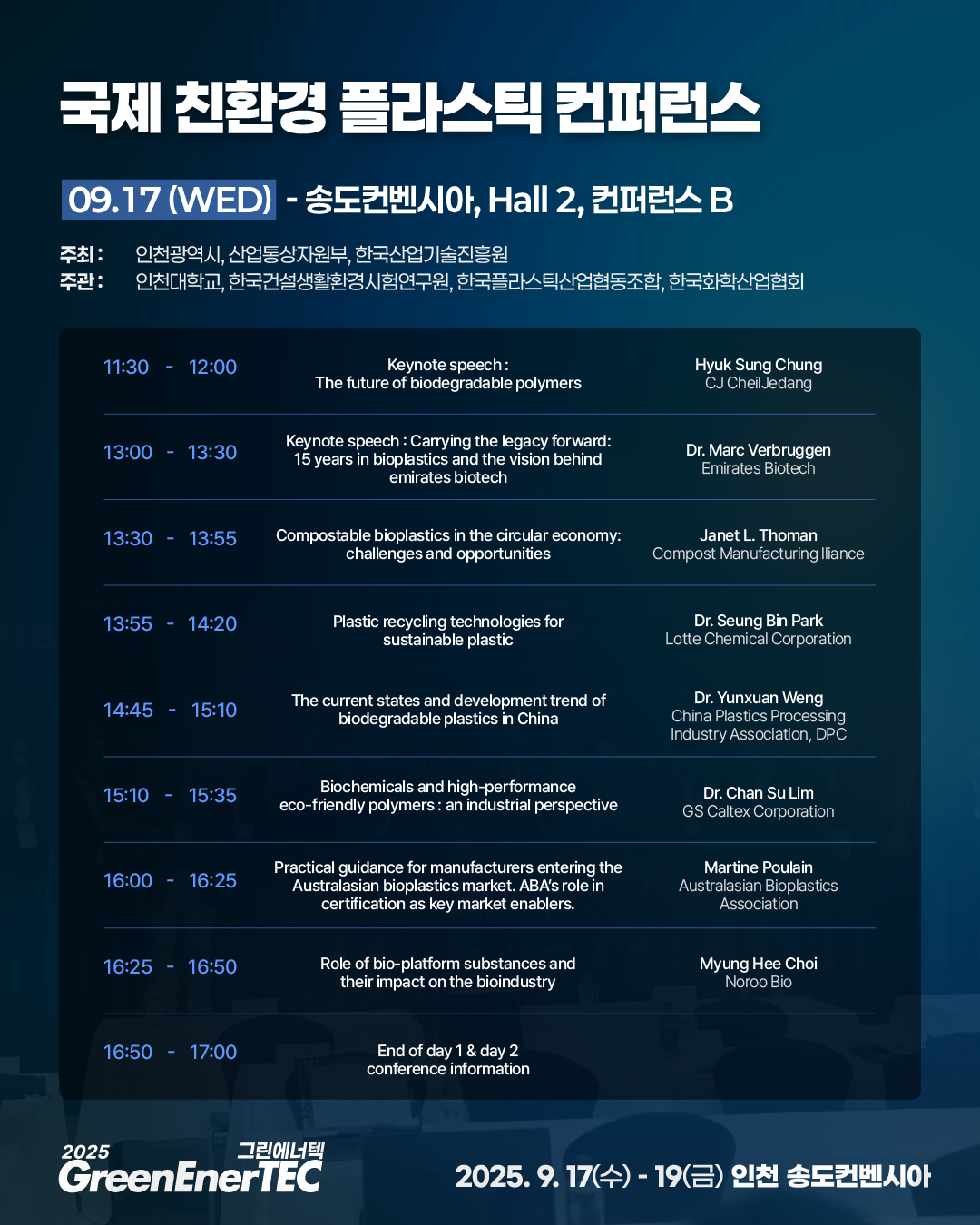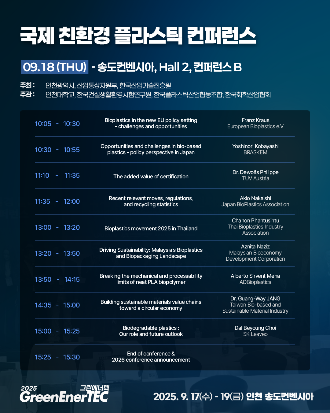 The conference includes global speakers from Europe, the USA, China, Japan, Vietnam, and Thailand, focusing on international trends and activation policies for biodegradable plastics.
